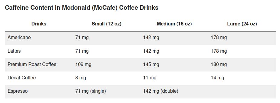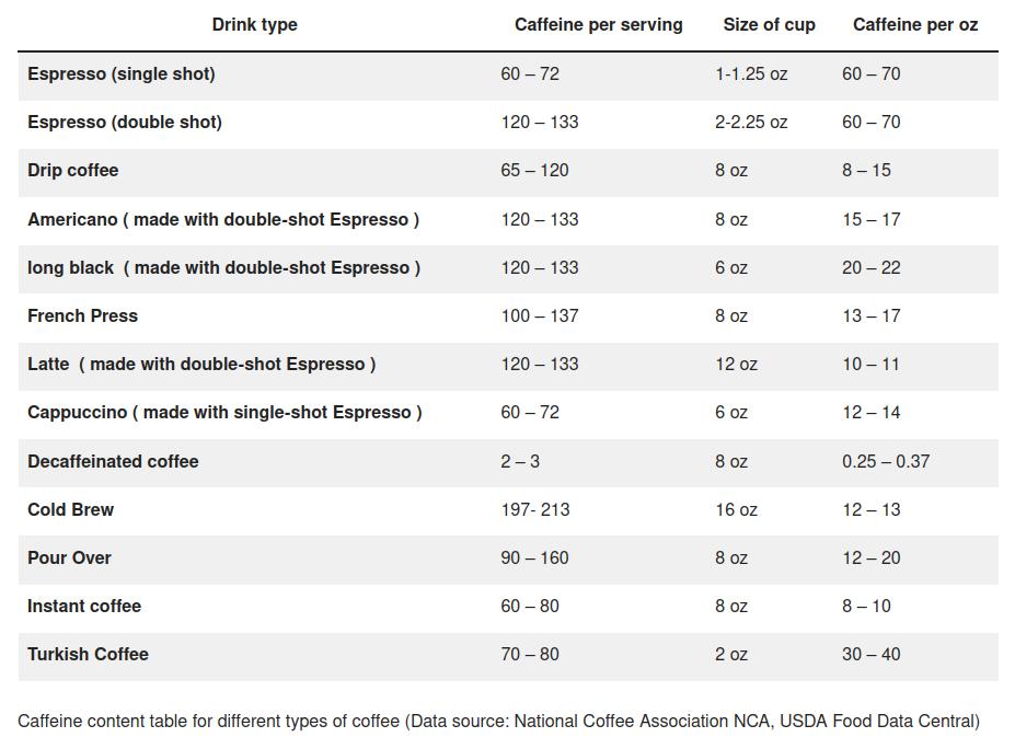 If you have Mediterranean sensibilities and would rather pluck hairs from a sleeping grizzly than drink instant coffee, the following table shows the caffeine content of various other types of coffee beverages.