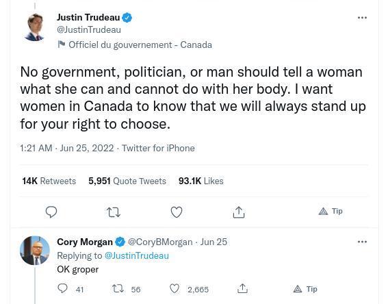 "No government, politician, or man should tell a woman what she can and cannot do with her body. I want women in Canada to know that we will always stand up for your right to choose.”