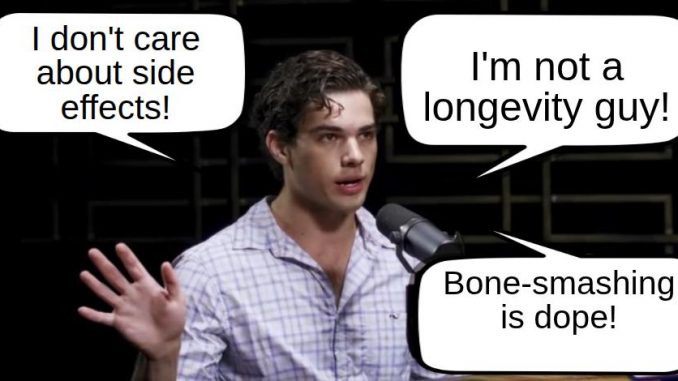 If, and I gotta doubt he is taking all of those drugs, but if he is, good chance his balls shrivel up and he’ll be bald and have no teeth and be covered in sores, all in two years. Really “looksmaxxing” genius right there.