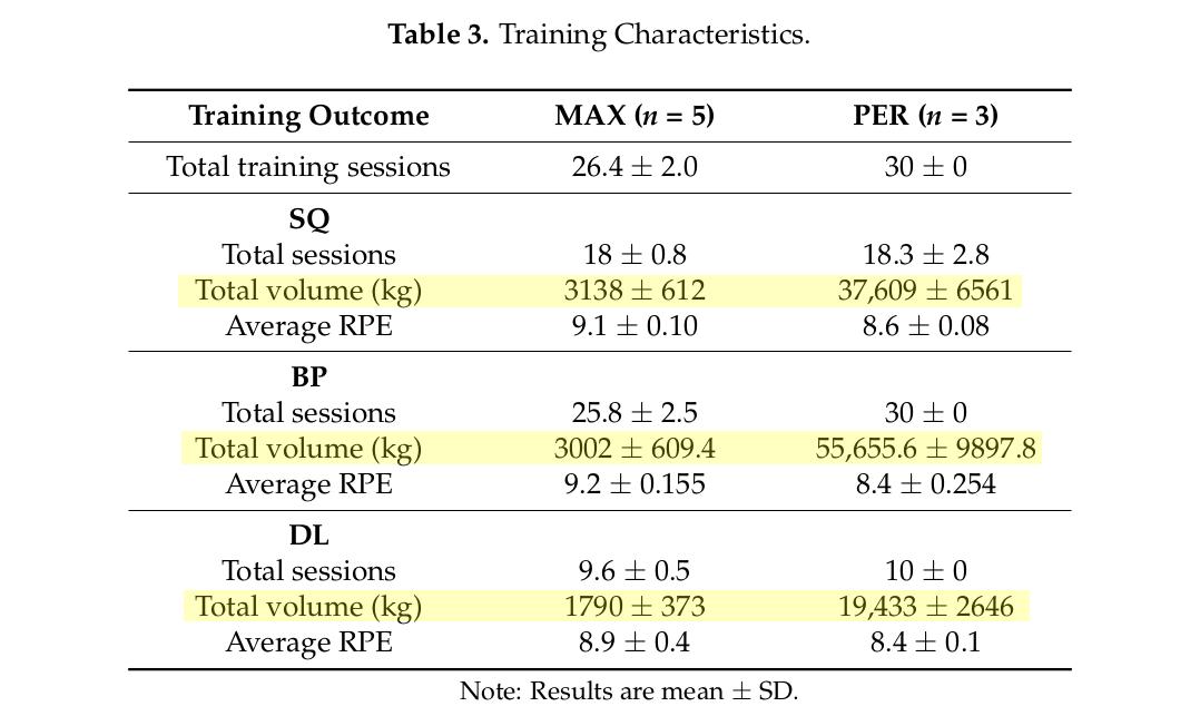 The training of the PER group was deliberately structured so that they didn’t go for an all-out max until competition day. So their highest totals during the study were achieved on competition day, at least for the two subjects who saw improvement.
