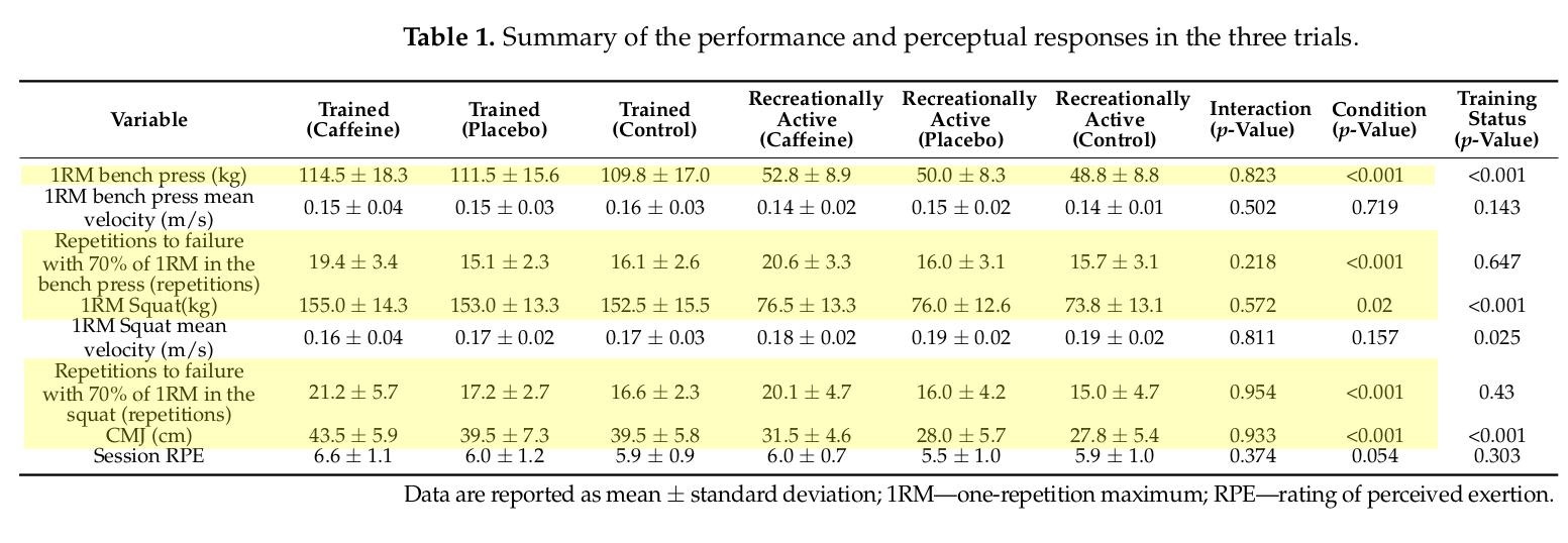 Irrespective of their training status, caffeine produced statistically significant increases in squat and bench press 1RM, squat and bench press repetitions to failure with 70% of 1RM, and countermovement jump height (see table below).