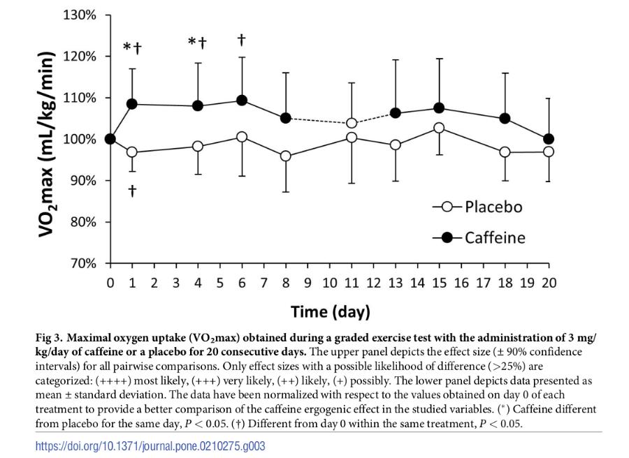 VO2max was higher to a statistically significant degree on days 1 and 4 when compared to placebo, with the difference diminishing by day 20. Compared to day 0 of the caffeine phase, daily caffeine intake increased peak power on days 1, 4 and 6.