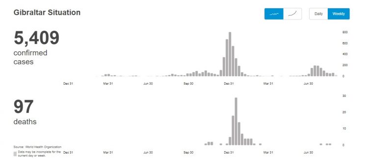 A mere 6.7 km2 in size and home to a population of less than 34,000 people, Gibraltar is a tiny country. But it has a big 'vaccination' rate, and currently holds the title as the world's most heavily jabbed country. With a 'vaccination' rate of 234.56 per 100 people, it seems Gibraltar got a head start on the whole 'booster shot' charade. The WHO chart below shows COVID-19 cases peaked in the country the week beginning 4 January 2021. The 'vaccination' rollout began on 10 January 2021. The decline that appears to have begun before mass 'vaccination' kicked off continued through mid-February, which was then followed by a plateau of low case and death numbers.