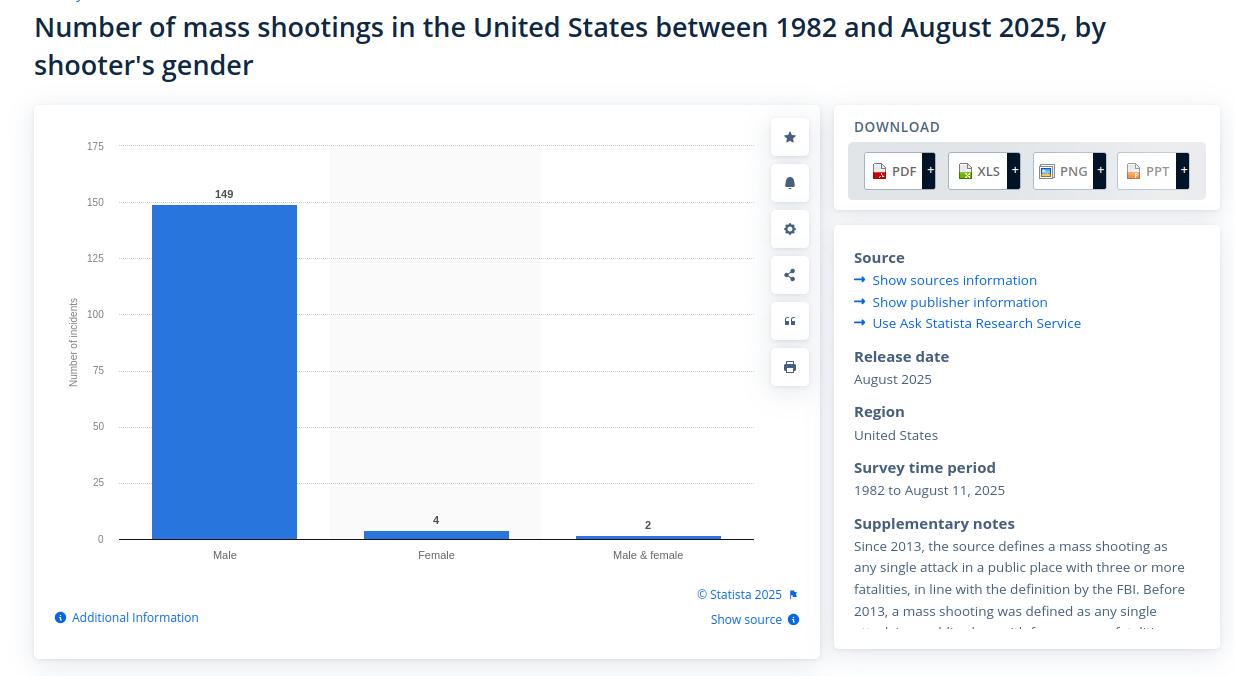 Thanks for that most interesting Statista chart, however, for the sake of presenting comparable metrics, one needs to adjust the male, female and transgender figures to account for their proportions of the population. The weighted male mass shooter number therefore becomes 298, the weighted female mass shooter number becomes 8 and the weighted transgender mass shooter number becomes 667 because transgenders make up no more than 0.3% of the population. This does not mean that I think transgender people should be automatically refused firearms licences, but perhaps there is a case for enhanced background checks for such people in the same way that such enhanced checks are applied to those who have a history of mental illness. But I agree wholeheartedly with you that if someone is going to propose gun ownership restrictions on a class of people then they should acquaint themselves fully with all aspects of the reasons for doing so.