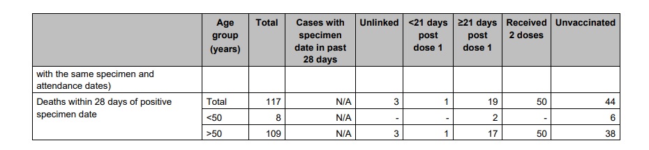 The table shows that at 28 days, 53,822 of the 92,029 documented Delta cases were in unvaccinated people. So at first glance, it appears the unvaccinated are at higher risk. But a closer look at the figures tells a very different story. The higher case numbers applied to under 50s only; in the over-50s, more people with Delta infections had received the clot shot (3,954 vaxxxinated versus 3,546 non-injected).