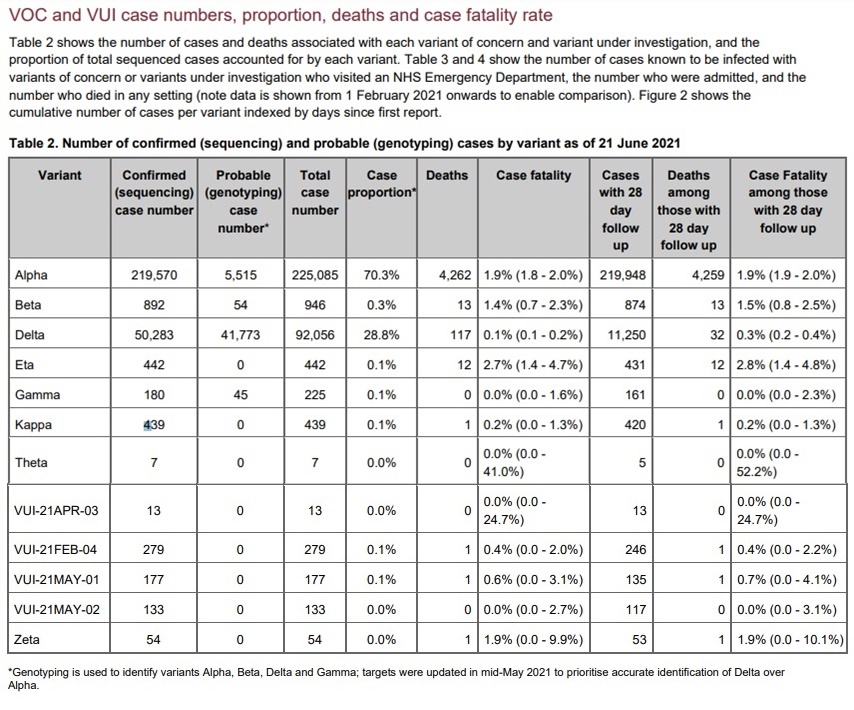 The table below is from a 25 June 2021 UK government briefing titled "SARS-CoV-2 variants of concern and variants under investigation in England."