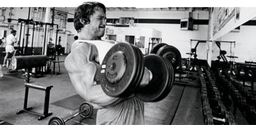 In contrast, ‘cheating’ on the biceps curl would involve leaning forward at the start of the movement, then reflexively leaning back in order to swing the weight up. As the set progresses and the reps become increasingly difficult, further cheating would occur when the weight reaches the mid-way sticking point. To get the weight past this sticking point, our intrepid bro would lean backwards like Schwarzenegger is doing in the picture above.