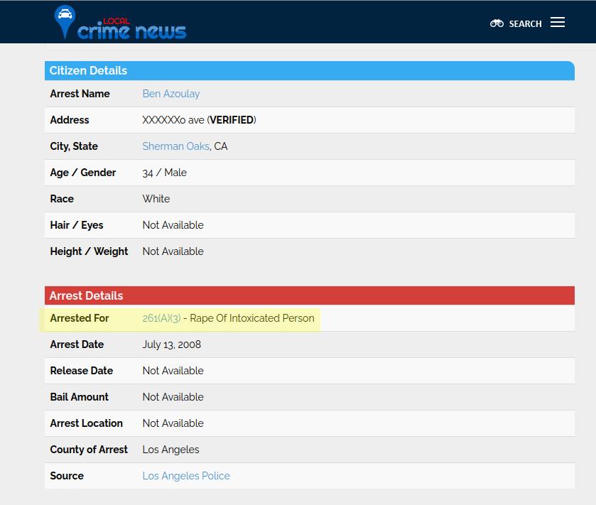 On July 13, 2008, Benjamin Azoulay of Sherman Oaks, California was arrested and charged under penal code § 261(a)(3) - “Rape of intoxicated person”.