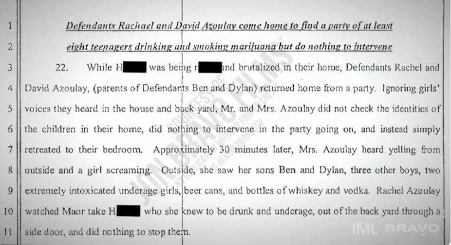 While all this was going on, Rachel and David Azoulay, proud parents of the vile Ben and Dylan, returned home to the sound of young female voices but thought nothing of it and went to bed. A half-hour later, Rachel Azoulay heard a girl screaming. She got up, went outside and saw her sons, three other males, and three extremely intoxicated young girls. According to the court filing, Rachel witnessed Maor take H, “who she knew to be drunk and underage,” out of the backyard through a side gate but did nothing to intervene.