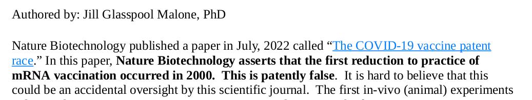 "Nature Biotechnology," complains Jill, in bold type, "asserts that the first reduction to practice of mRNA vaccination occurred in 2000. This is patently false."