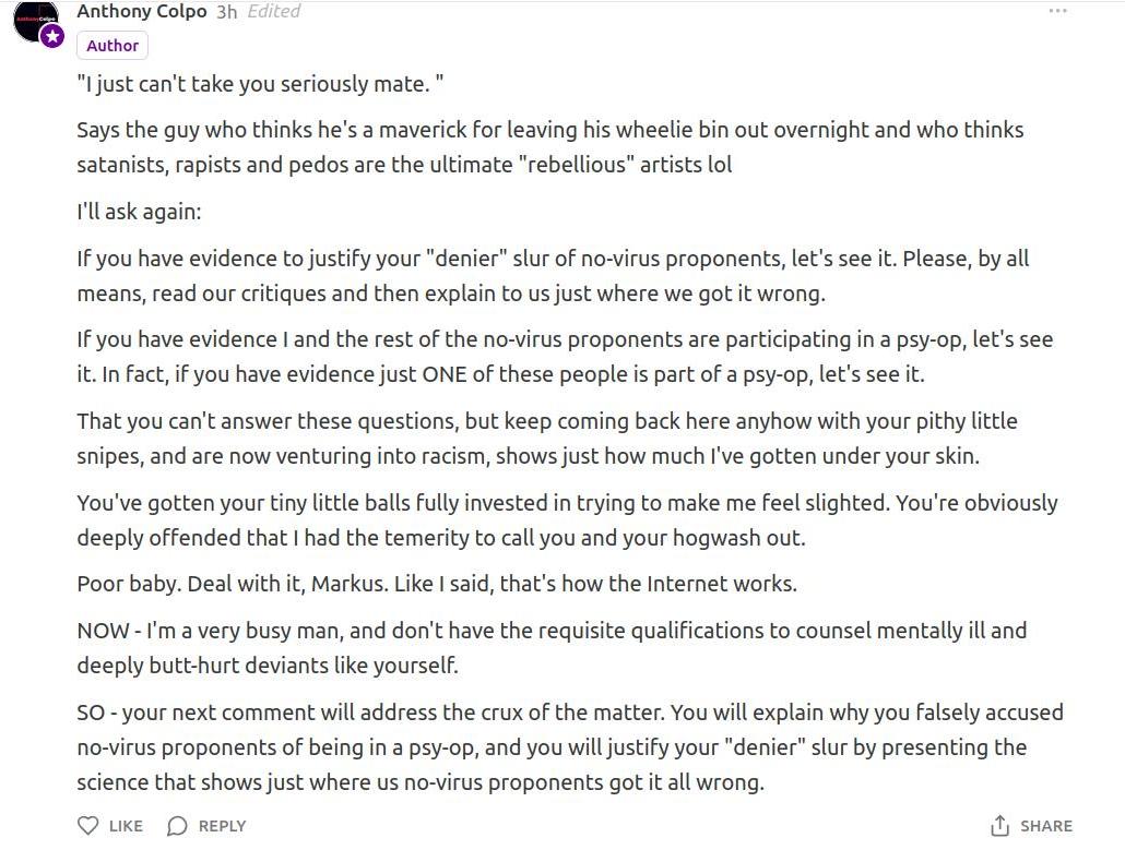 What we all want is the evidence he should already have had at hand before vomiting the contents of his brain all over the screen in a deranged rant that made patently false accusations about virus skeptics.
