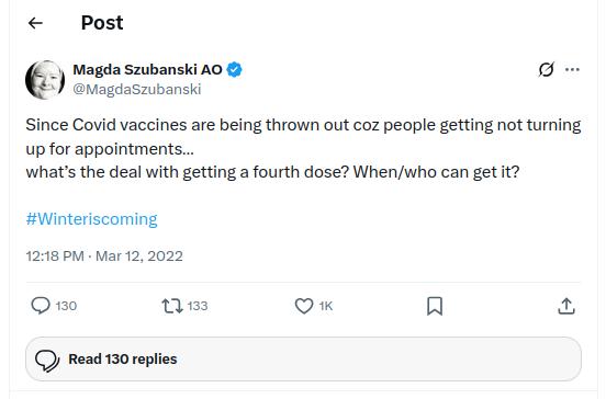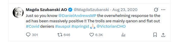During Victoria’s COVID tyranny, Szubanski was trotted out by the Andrews regime along with a number of other celebrities to appease the masses and assure them it was all for their own good.
