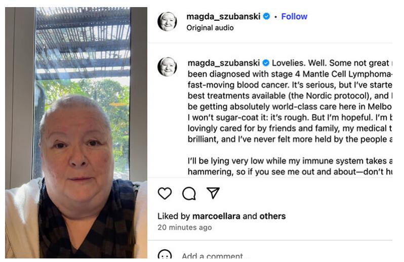 Australian actress/comedian Magda Szubanski was recently diagnosed with stage 4 Mantle Cell Lymphoma, a rare and aggressive form of non-Hodgkin lymphoma. Stage 4 means the cancer is advanced and has spread from the lymphatic system to at least one other organ.