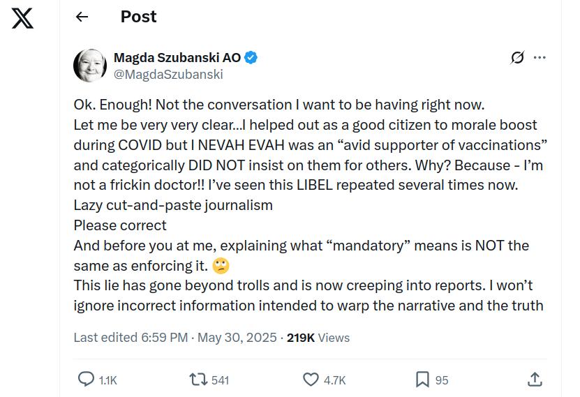 Whatever her intentions, Szubanski was wrong in her support of Andrews and his demonstrably fraudulent lockdowns, and she was wrong to encourage the wearing of useless and counter-productive masks.