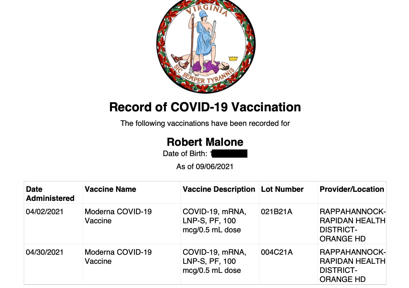 If Malone wasn’t vaccinated and didn’t have a vaccine card, one wonders where this image came from. It’s an alleged vaccine certificate Malone posted to his website the very same day I sent him an email questioning him, among other things, about his ‘vaccination’ claim.