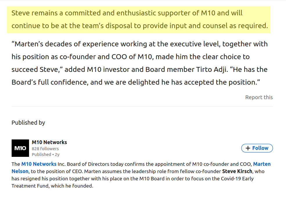 Leading a company that wants to lead the world into cashless tyranny doesn’t look good on the bio of a supposedly selfless freedom fighter, so in September 2021 Kirsch stepped down from his role of M10 CEO, reportedly “in order to focus on the Covid-19 Early Treatment Fund, which he founded.”