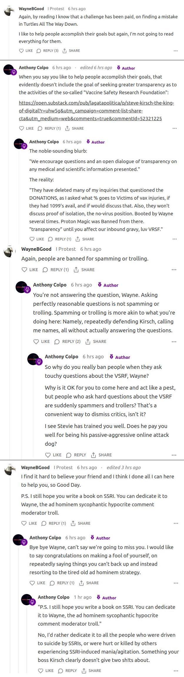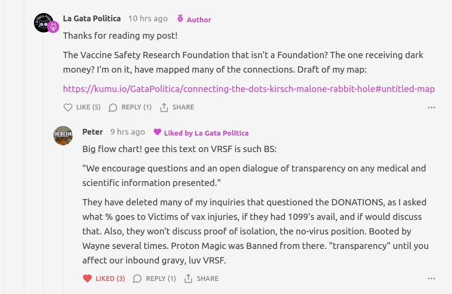 “Peter” says he and another Kirsch reader have repeatedly asked what happens to VSRF donations, what portion goes to vaxxx victims, and if the foundation had financial statements available. Instead of straight answers, they’ve been met with comment deletions and even banning by a character called Wayne.