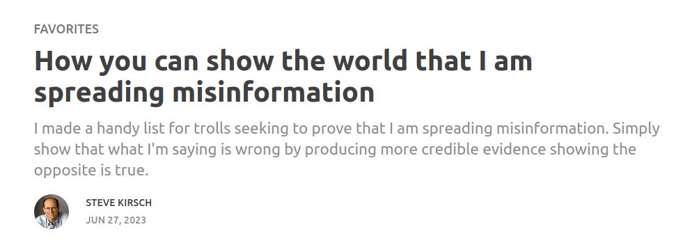The cocksure Kirsch, high on his own hubris, has a page at his Substack titled How you can show the world that I am spreading misinformation.”