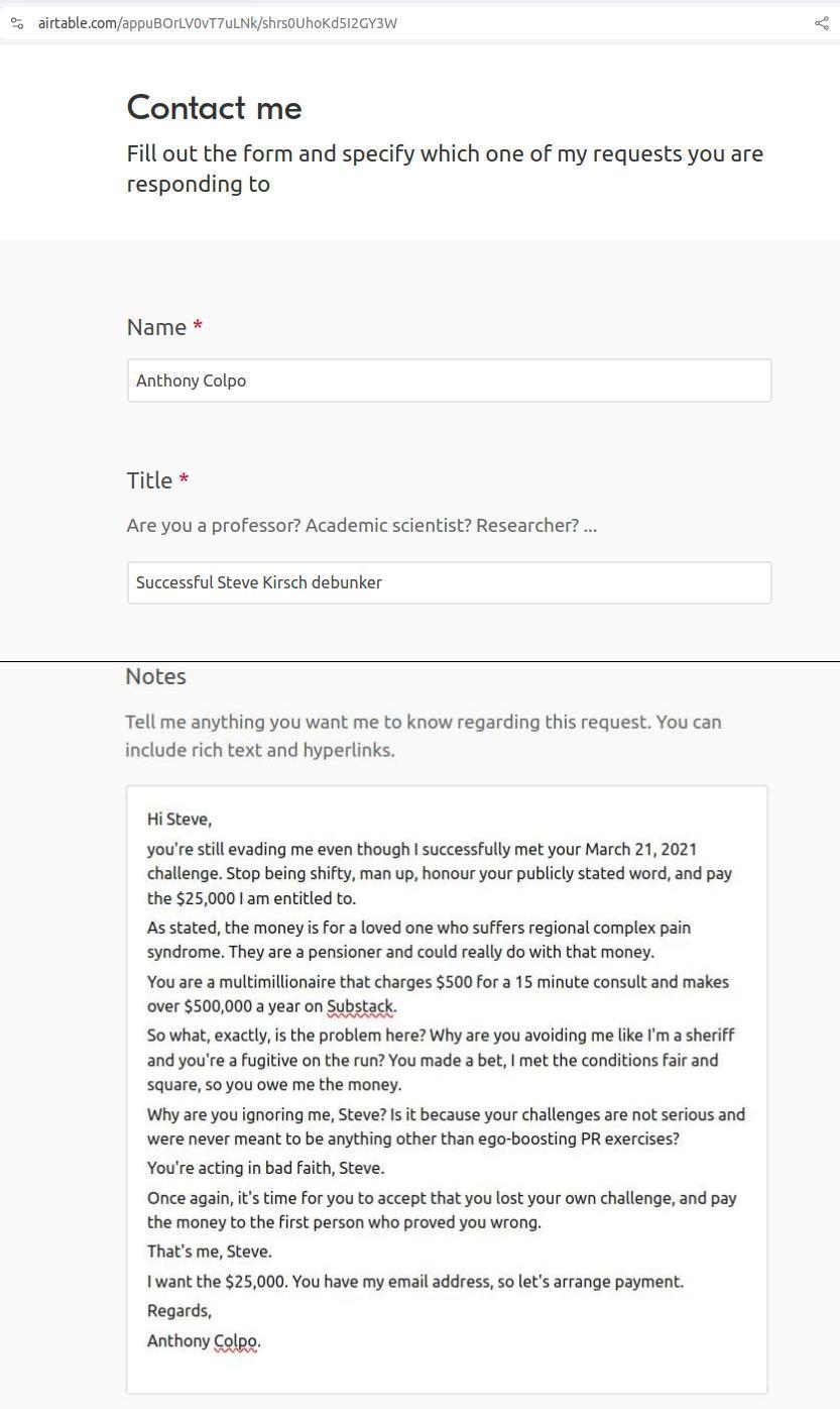 There was nothing to “debate.” Kirsch had asked for “hard evidence” that he was wrong, and I supplied it, in careful detail. The challenge had been met, and Kirsch now owed me $25,000.