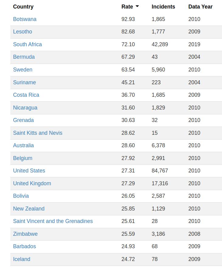 I submit that any movement claiming "gender violence" and sexual assault is a product of capitalism - a historically recent system of economic exchange - has absolutely no clue about the true psychopathology of rape. And little clue about life in general. Unlike feudalism, moocher Karl's communism, hunky Benito's fascism, or whatever other oppressive authoritarian system the gender-neutral "disrupters" at me too fancy, capitalism has allowed unprecedented numbers of women to achieve financial independence - even to start their own businesses and become very wealthy. And to portray rape as a predominantly white problem is, well, racist. Here are the 20 countries with the highest incidence of reported rape per capita: