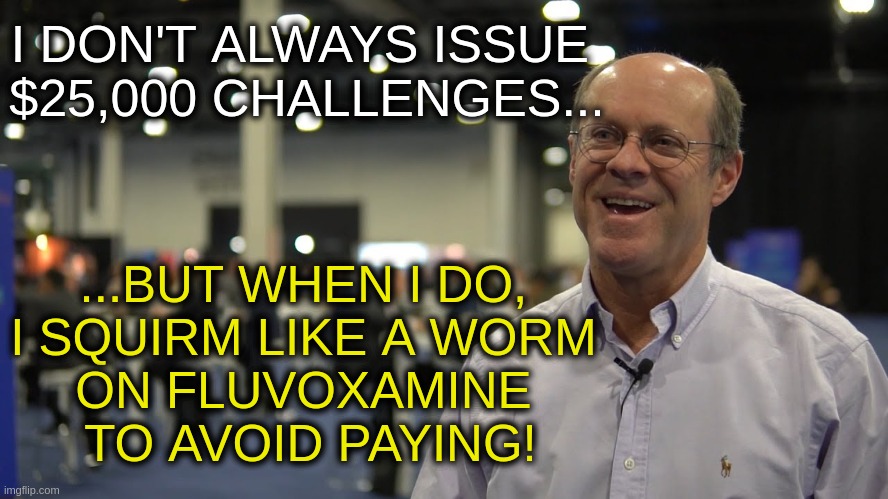 As I explained to Kirsch when I notified him of my response to his challenge, I want to give the money to a loved one who, through no fault of their own, suffers a painful condition called regional complex pain syndrome. They deserve that money – Kirsch doesn’t. He’s a self-aggrandizing carnival barker that loudly issues challenges, usually framed in a manner that makes them impossible to meet. He slipped up on the fluvoxamine challenge, I’m guessing due to a combination of hubris and scientific ineptitude.