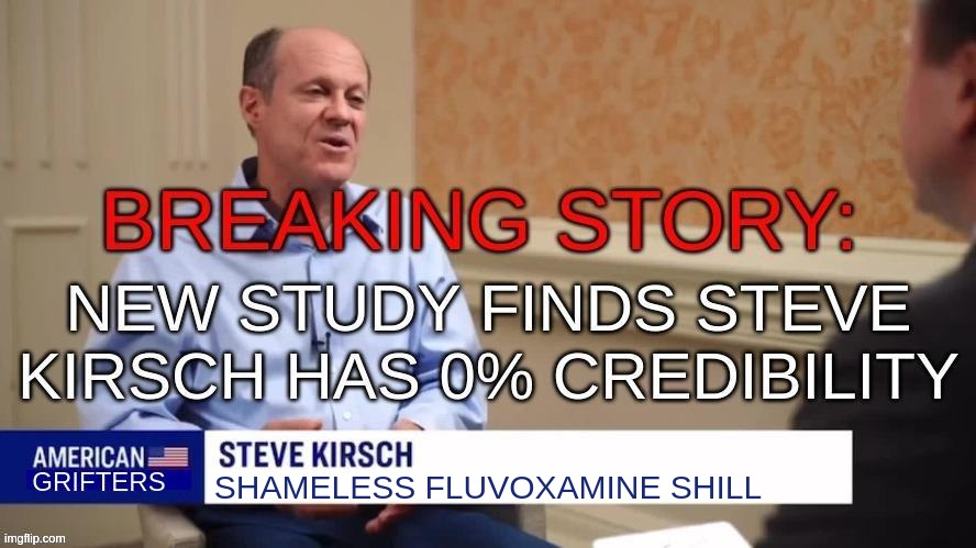 • Oh, and did I mention that falsely pimping fluvoxamine as a “safe, fast, easy, 100% effective” treatment for ‘COVID’ – as your deity Kirsch does – is “not a very logical way to alert people to the dangers of SSRI”?