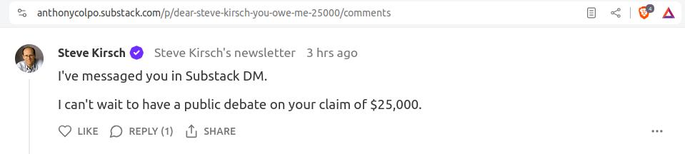 A few hours ago, Kirsch finally stopped ignoring me. Perhaps due to pressure from readers, he left the following comment underneath my response to his challenge: