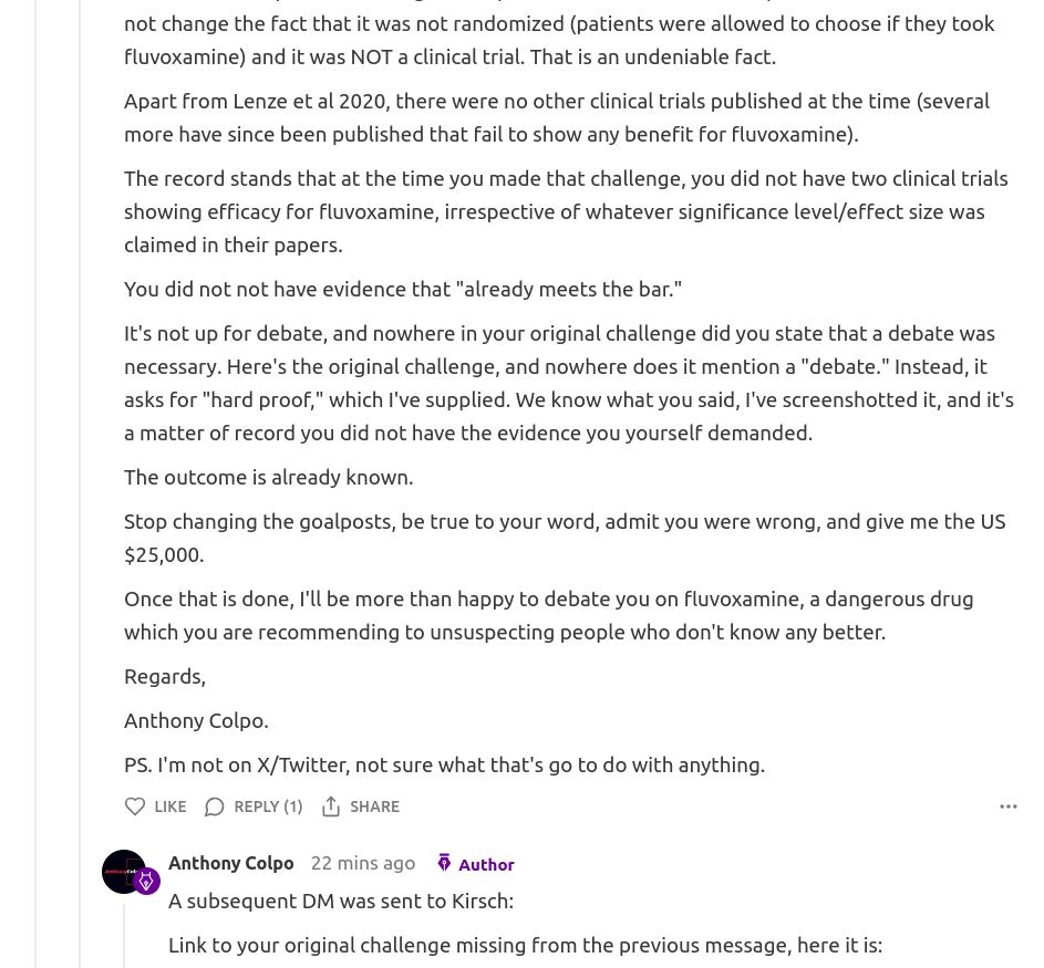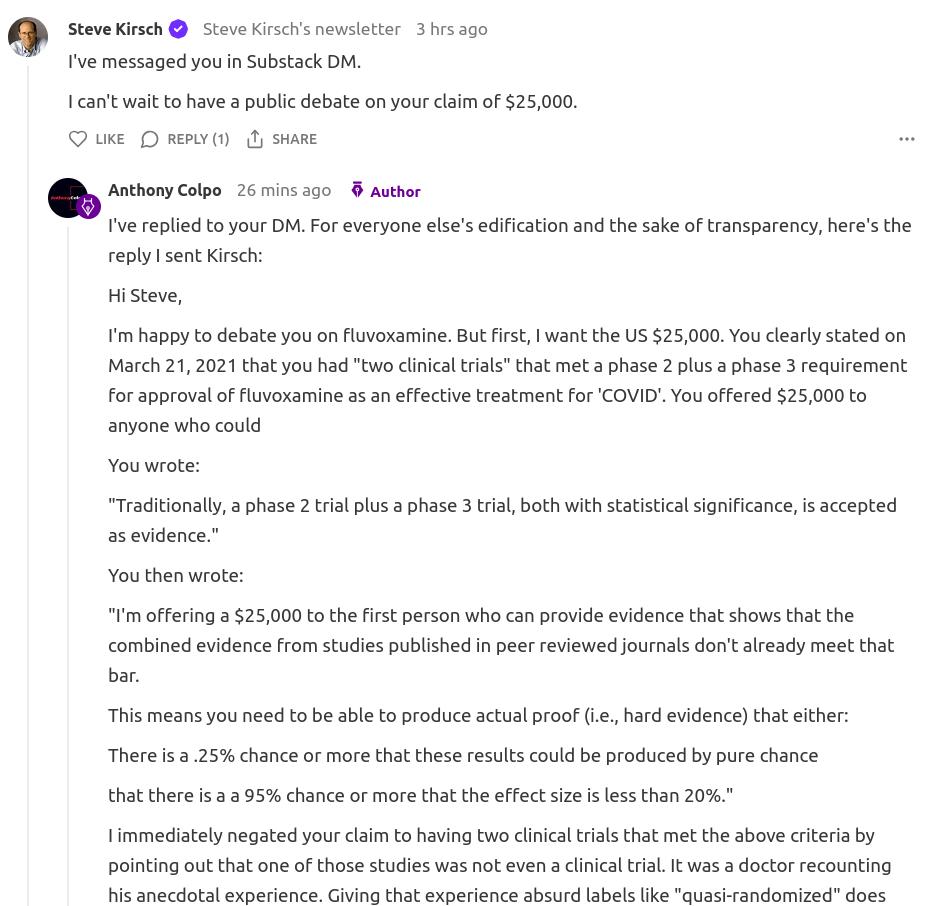 Yesterday, I posted a response to a $25,000 challenge regarding fluvoxamine issued by Steve Kirsch in 2021.