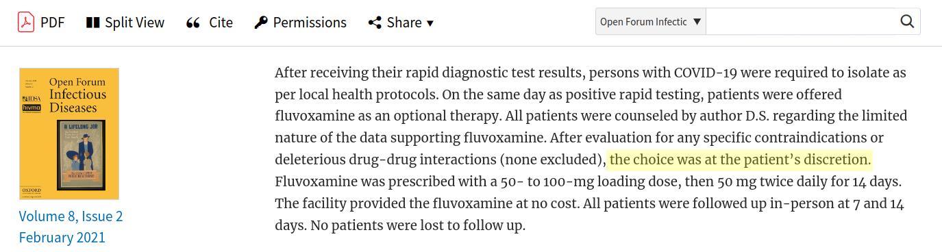The authors (and Kirsch) absurdly describe the study as “quasi-randomized.” Whatever the heck they’re trying to infer, it was not a randomized study. The paper clearly states the patients themselves were allowed to choose whether or not they took fluvoxamine: