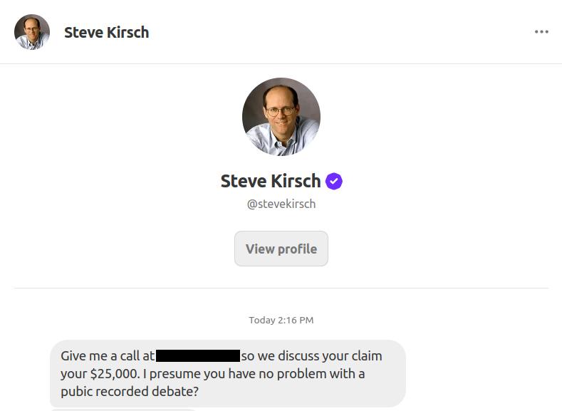 There is nothing to debate. Steve Kirsch lost his own challenge and owes me US $25,000.
