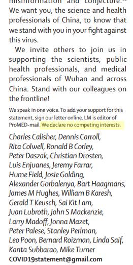 Despite these clear conflicts of interest, and the widespread controversy generated when Daszak's connections were made public, the Lancet is still shamelessly running the original letter complete with the patently false "We declare no competing interests" declaration by Daszak, Drosten and their co-authors.