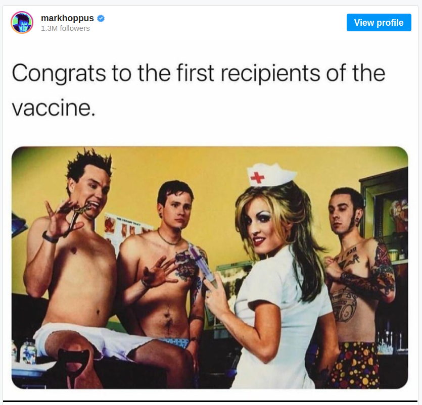 First case in point are the tattooed members of Blink-182, whose co-founder Mark Hoppus publicly expressed disappointment at Trump’s 2016 election win. That didn’t stop him and the rest of the band from eagerly embracing the highly toxic products of Trump’s Operation Warp Speed.