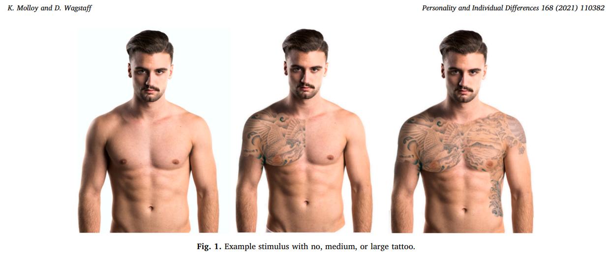 Polish researchers took photos of nine non-tattooed men aged between 19-35 years, and created two sets of images. One image showed each man in their non-tattooed state, the other was identical except for a tattoo of neutral abstract design photoshopped onto an upper arm.