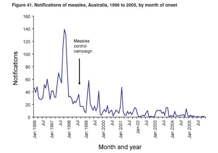 Here’s a graph of measles notifications in Australia between January 1996 and December 2005. Note that the graph erroneously begins with “Jan 1999”, because government.