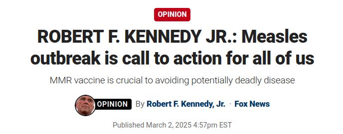 Anyways, in his Fox crock-ed, Bobby Jr tells us that, “as Secretary of the U.S. Department of Health and Human Services, I am deeply concerned about the recent measles outbreak. This situation has escalated rapidly, with the Texas Department of State Health Services (DSHS) reporting 146 confirmed cases since late January 2025”.