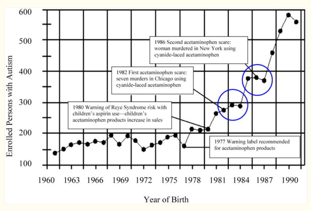 “In 1982 and again in 1986 there were product tampering cases where acetaminophen tablets were laced with cyanide resulting in eight deaths. Acetaminophen sales collapsed after each tampering event, but recovered in less than a year in each case. These dates roughly correspond to the slight downturns in asthma and autism cases mentioned above.” (Bold emphasis added)
