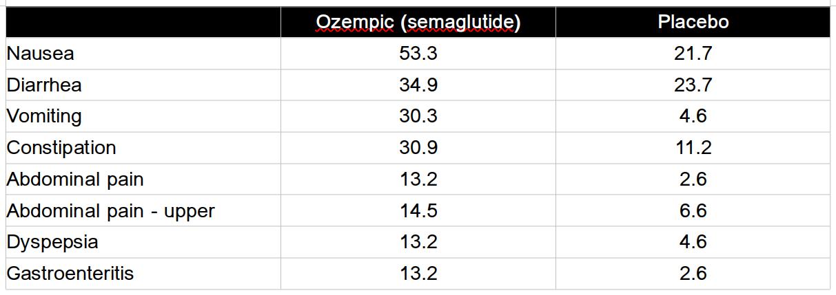 Clinical trials reliably show a high incidence of nausea and gastrointestinal side effects, with similar frequencies noted for semaglutide and tirzepatide. According to the package insert for Ozempic, "The most common adverse reactions, reported in ≥5% of patients treated with OZEMPIC® are: nausea, vomiting, diarrhea, abdominal pain and constipation."