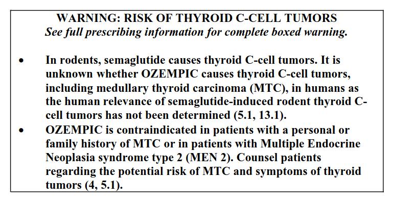 To top it all off, the Ozempic package insert contains a black box warning (the FDA’s highest safety warning) for the possible development of medullary thyroid cancer and multiple endocrine neoplasia syndrome type 2 (MEN-2).