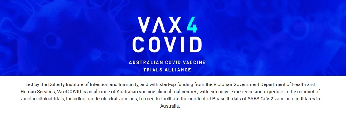 VIRGo leads the Vax4COVID alliance at the Doherty Institute for Infection and Immunity and the Murdoch Children's Research Institute. Vax4COVID, which received start-up funding from the Victorian Government (taxpayers get stitched yet again), "is an alliance of Australian vaccine clinical trial centres, with extensive experience and expertise in the conduct of vaccine clinical trials, including pandemic viral vaccines, formed to facilitate the conduct of Phase II trials of SARS-CoV-2 vaccine candidates in Australia."
