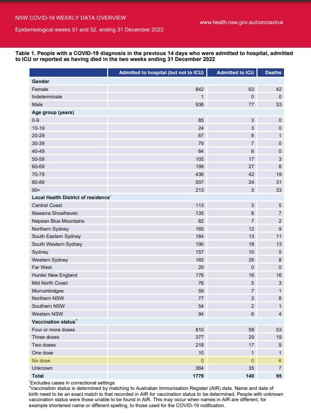 NSW Health, presiding over the country's most populous state, apparently couldn't bring itself to be as egregiously dishonest as its SA counterpart. Here is its December 31, 2022 update on 'COVID' hospitalizations and deaths in New South Wales. The figures for those who had zero clot shots are highlighted in yellow, near the bottom: