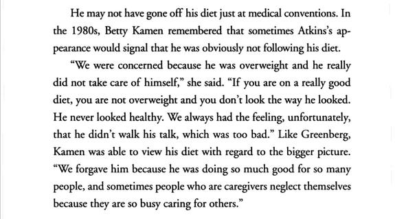 In Dr. Robert Atkins: The True Story of the Man Behind the War on Carbohydrates, we learn that Atkins' staff joked about his overweight. We learn the most famous weight loss guru of all time was in fact overweight and “never looked healthy.”