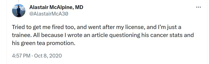 Turns out Freedhoff is not the only health professional to attract the wrath of Fung. In October 2020, Alastair McAlpine, MD, revealed in a tweet that Fung had also tried to get him fired after he questioned Fung's very questionable cancer claims and tea promotion.