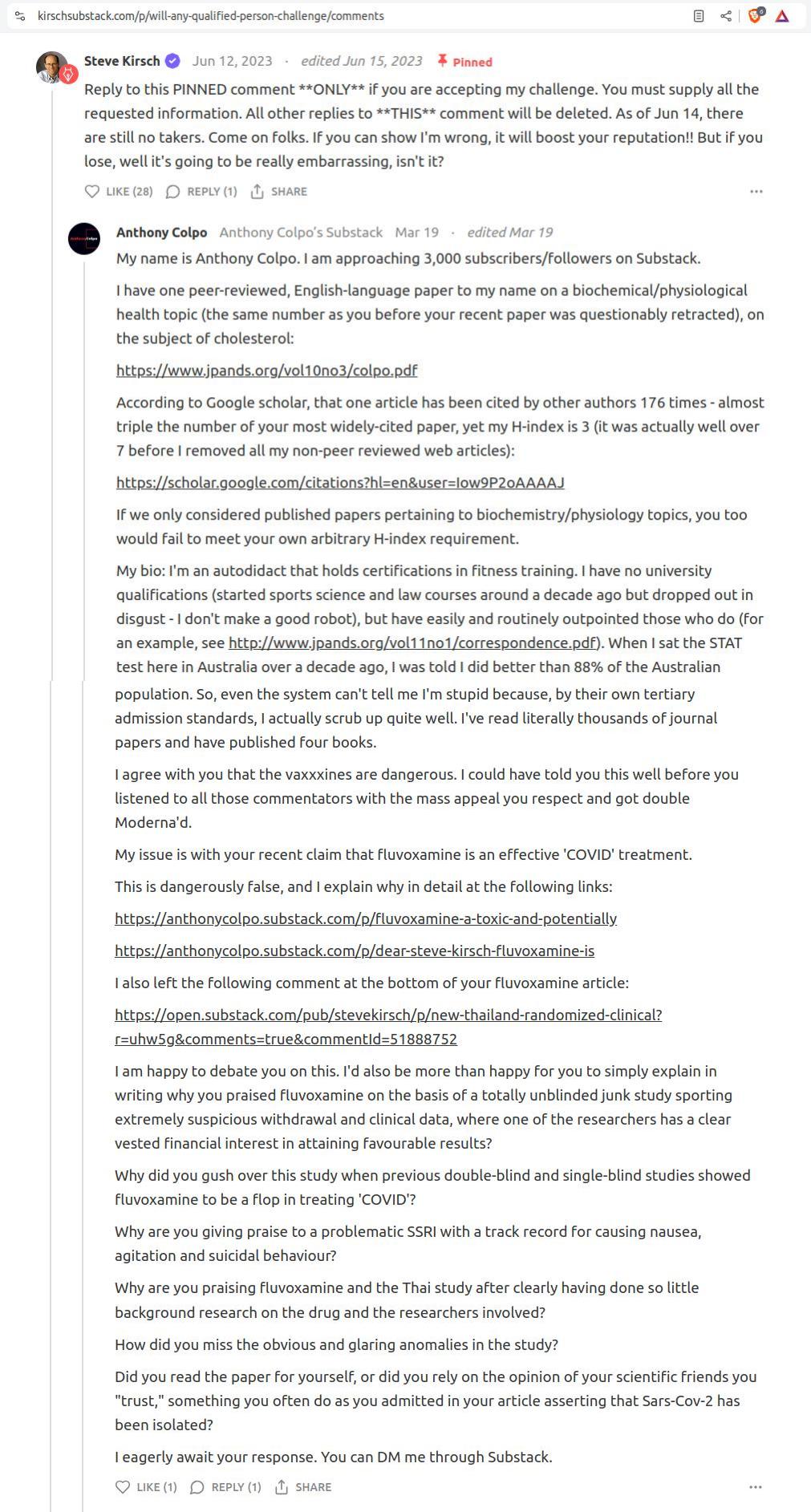 There was nothing to debate. I met the requirements of the challenge. I proved beyond doubt Kirsch did not have the results of 2 randomized, controlled clinical trials proving efficacy of fluvoxamine in the treatment of’COVID.’
