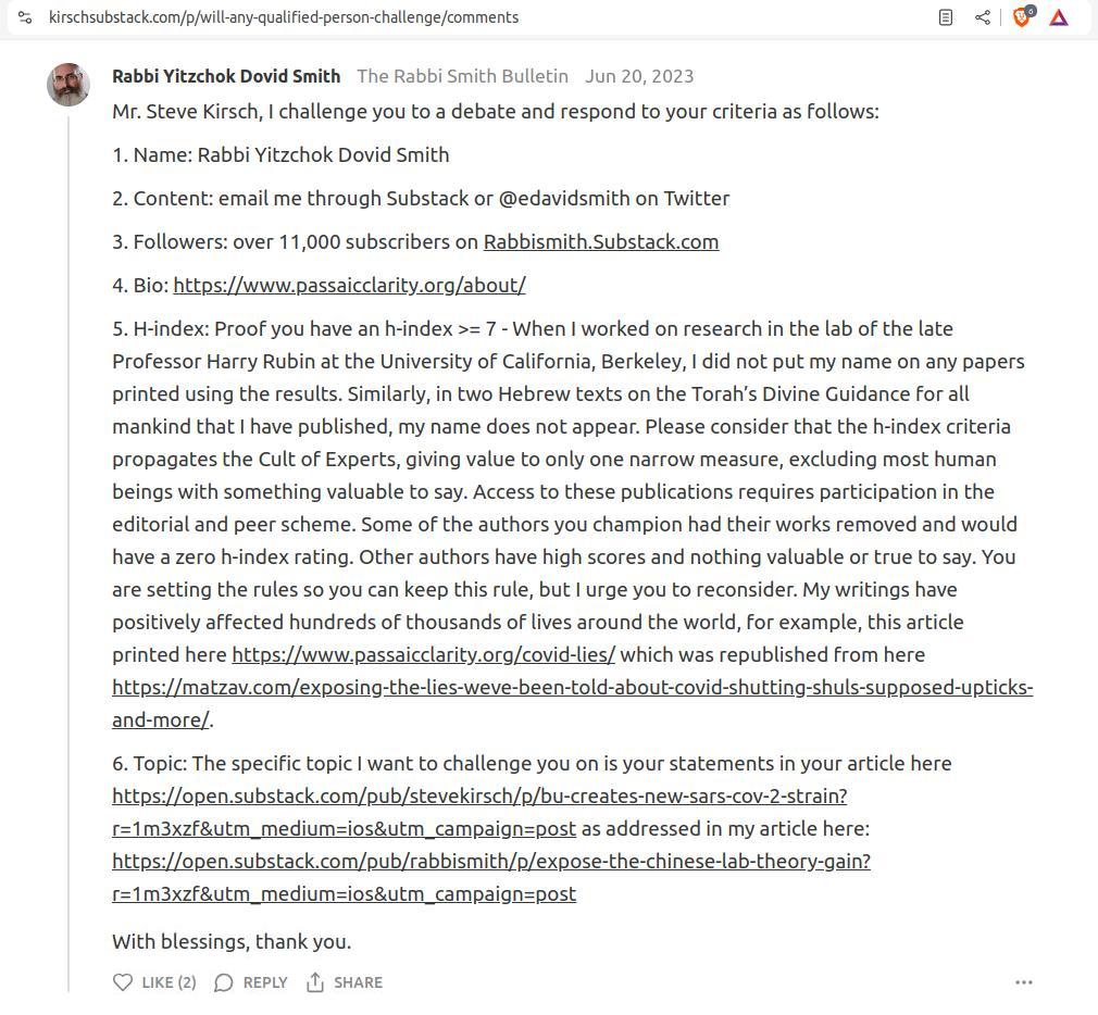 Here’s the reply to Kirsch’s challenge by Rabbi Yitzchok Dovid Smith, posted back in June 2023. That reply, offering to debate Kirsch on the virus paradigm, also remains unanswered by Koward Kirsch.