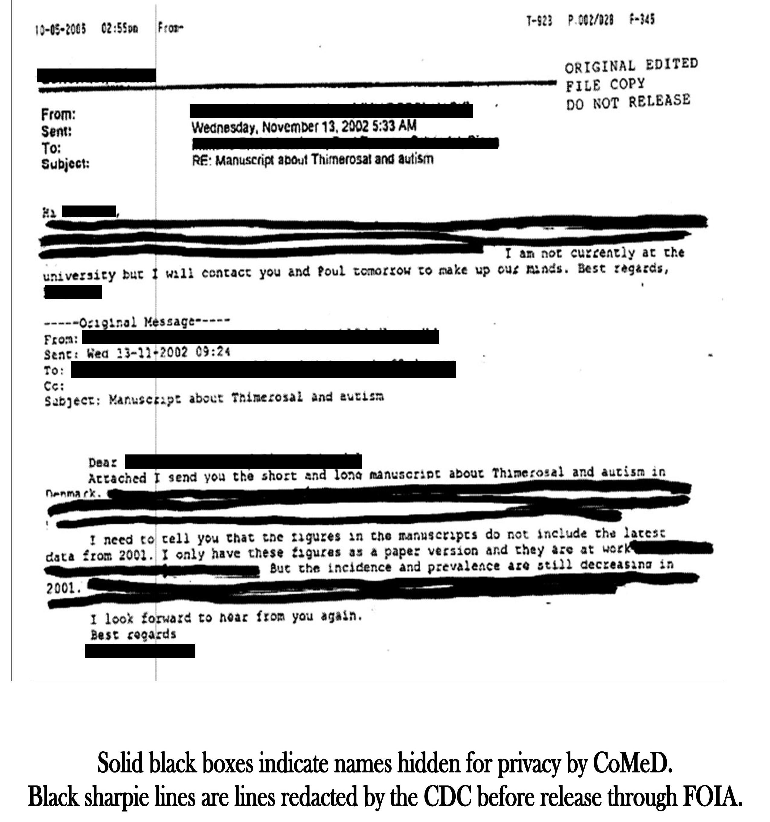 One coauthor from Aarhus University, Denmark, whose name has been redacted, was aware of the omission and stated in a 2002 email to the CDC, "Attached I send you the short and long manuscript about Thimerosal and autism in Denmark ... I need to tell you that the figures do not include the latest data from 2001 ... but the incidence and prevalence are still decreasing in 2001" (Bold emphasis added).