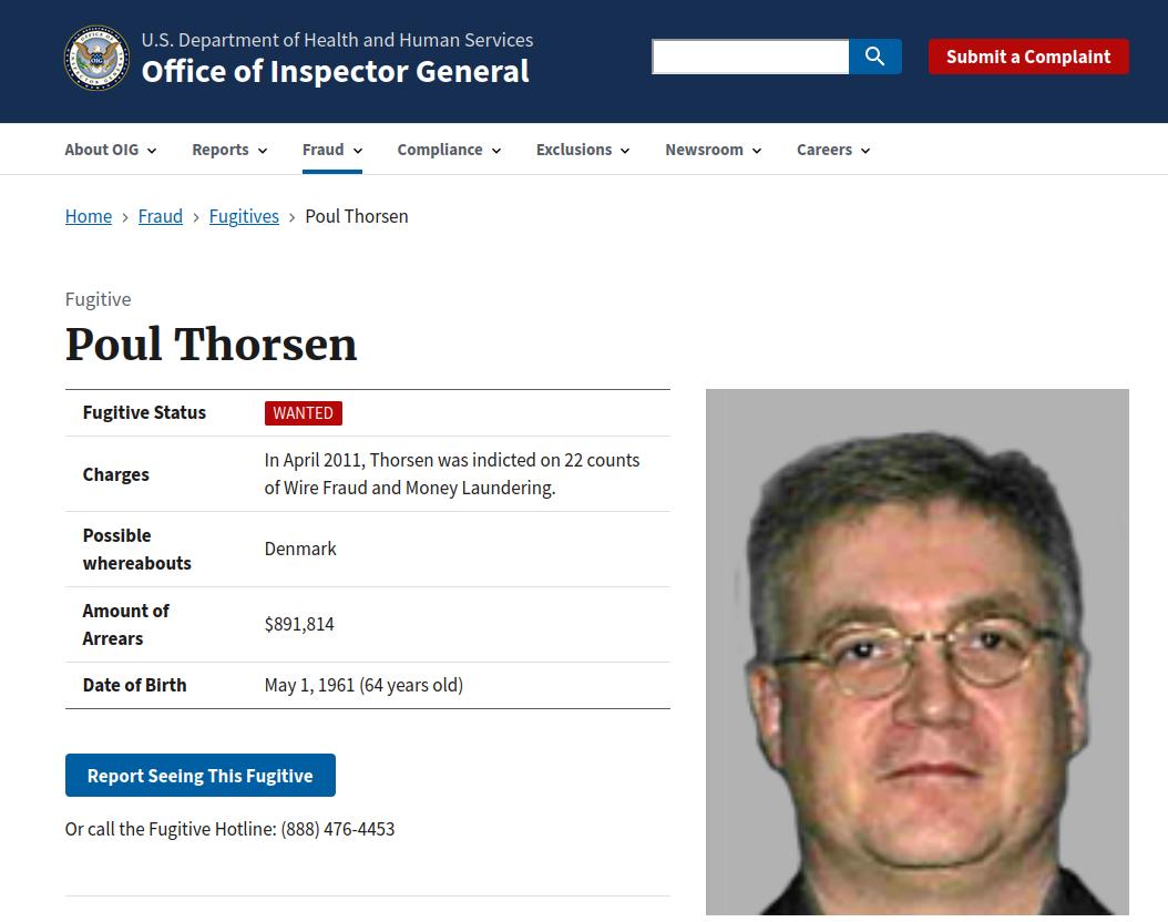 In response, Thorsen fled the US. He remains on the HHS-OIG wanted list as a fugitive.