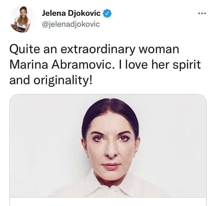 Djokovic’s wife Jelena has publicly expressed her admiration for fellow Serbian, Marina Abramovic. Those of you who’ve done any research into the twisted tendencies of our so-called ‘elite’ (parasite) class will be familiar with this dubious character.