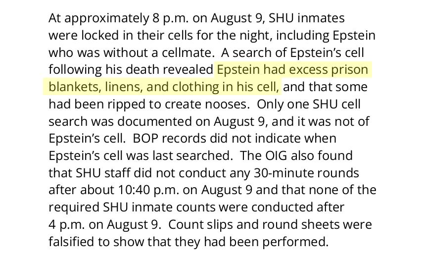 The US government keeps telling us no-one entered Epstein’s tier between 10:40 pm and 6:40 am, the period in which he allegedly crafted a hanging rope and hung himself. You know, from the “excess” of laundry that was delivered to his room which, you know, contained a guy on suicide watch.
