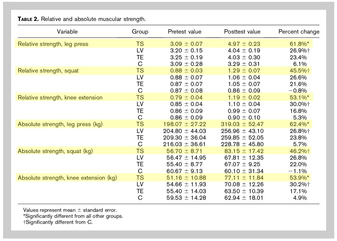 The 2/4 group increased significantly more than the SS group on bench press (34% vs 11%), lat pulldown (27% vs 12%), leg press (33% vs 7%), leg extension (56% vs 24%), and leg curl (40% vs 15%).