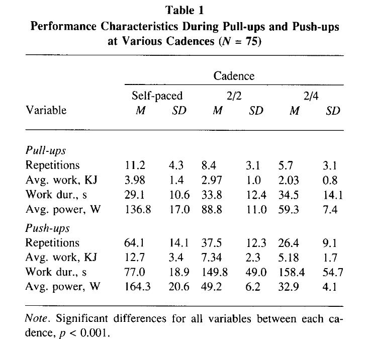 Seventy-five “moderately-trained” college-age men participating in strength classes were recruited for the study. In randomized crossover fashion, each subject was tested for the maximum number of repetitions they could achieve on the push-up and pull-up exercises, using the following tempos: